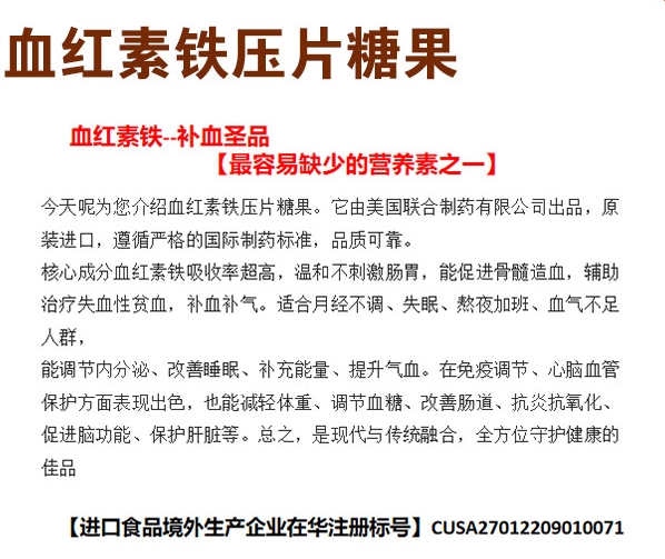 【產(chǎn)品名稱(chēng)】:血紅素鐵壓片糖果 進(jìn)口產(chǎn)品