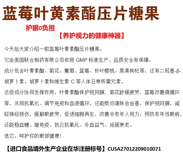 【產(chǎn)品名稱】:藍(lán)莓葉黃素酯 壓片糖果 進(jìn)口食品